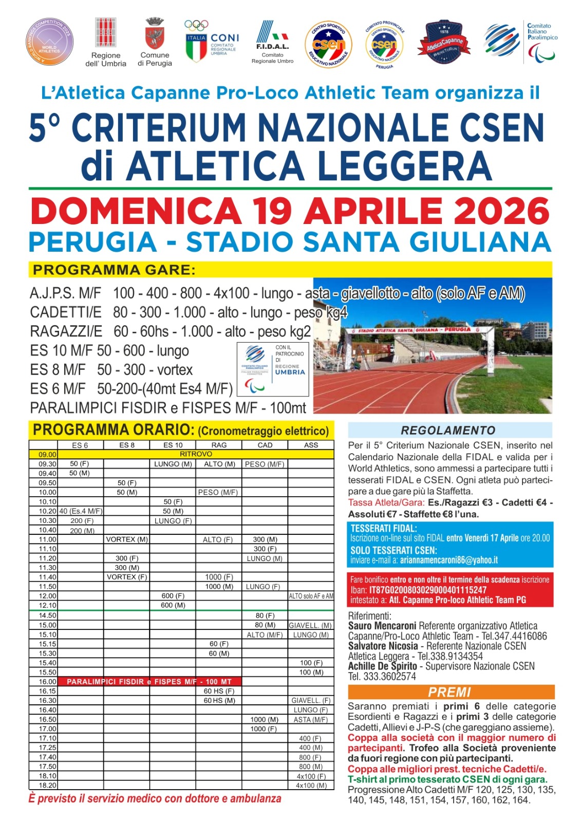 IL GIORNO 19 APRILE 2026 SI TERRA' A PERUGIA, PRESSO LO STADIO DI SANTA GIULIANA, IL 5° CRITERIUM NAZIONALE CSEN ATLETICA LEGGERA.